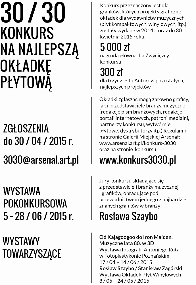 Konkurs „30 / 30” na najlepszą okładkę płytową to niejedyne wydarzenie, jakie w ciągu najbliższych miesięcy odbywa się w poznańskiej Galerii Miejskiej „Arsenał”, a które łączy sztuki plastyczne z muzyką. Już 17 kwietnia start niezwykłej wystawy stereofotografii Antoniego Ruta, który uwiecznił koncerty odbywające się w latach 80. Na wystawie prezentowanej za pomocą Fotoplastykonu Poznańskiego pojawią się m.in. zdjęcia ze słynnego poznańskiego koncertu Iron Maiden w 1984 r. (po którym to poszukujący wieczornej rozrywki „Ironsi” postanowili zagrać na weselu odbywającym się w restauracji „Adria”), Metalmanii’ 87 i ’89, a także koncertów podczas festiwalu Rock Arena w 1985 r. Zdjęcia dokumentują również koncerty Thomasa Andersa (podczas pierwszego rozłamu Modern Talking) czy niegdyś bardzo popularnego Kajagoogoo.